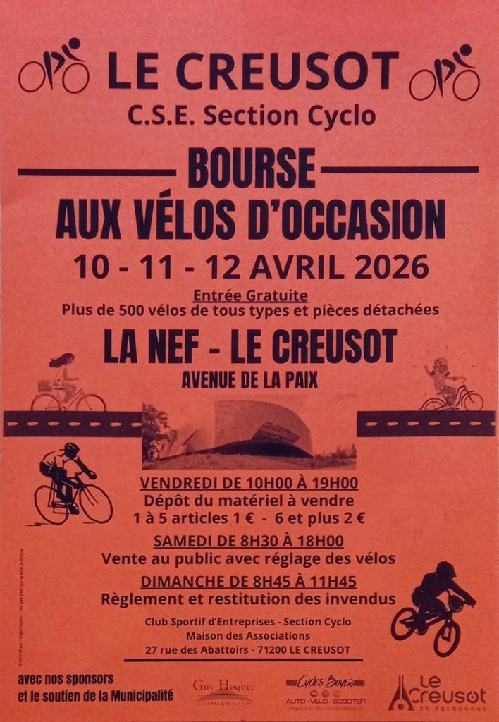 Par Giovanni1 avril 20260 commentaireNon classé Nos amis du CSE Cyclo organise les 10, 11 & 12 Avril 2026, la Bourse aux vélos d’occasion, à la Nef au Creusot. L’entrée est gratuite .